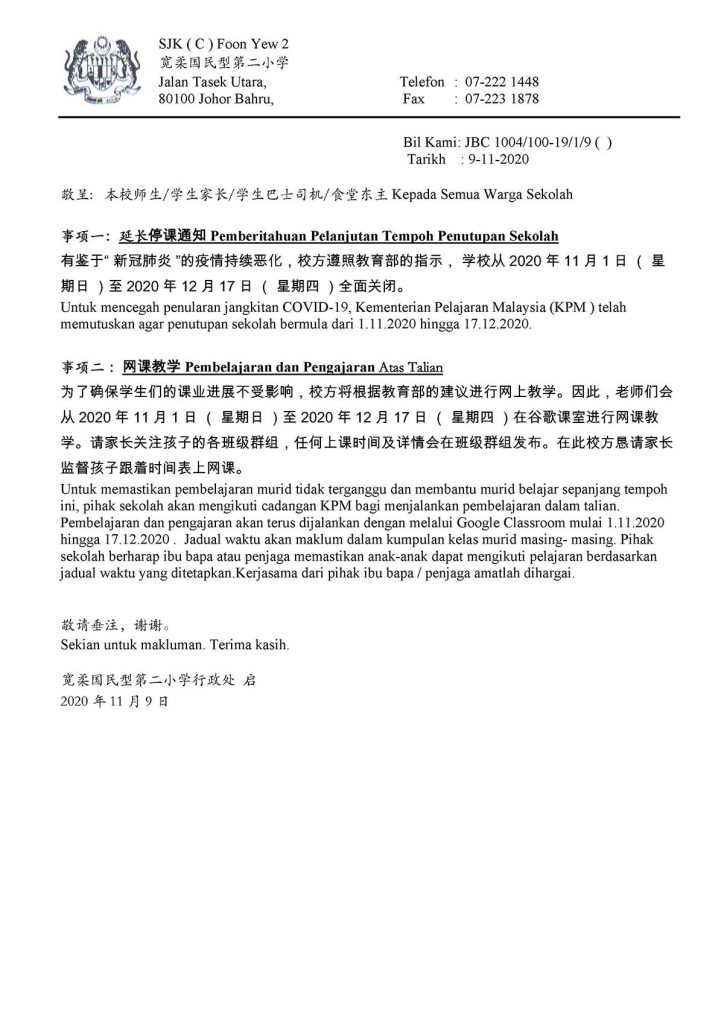 事项一:延长停课通知 Pemberitahuan Pelanjutan Tempoh Penutupan Sekolah