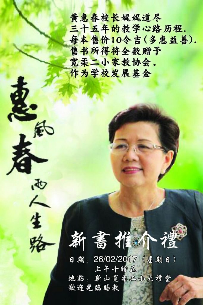 新闻 通告 通告与新闻 《惠风春雨人生路》新书推介礼 February 13, 2017February 13, 2017 AdminTeam 4840 Views 如果你曾经阅读过黄惠春校长在报章上发表的三篇文章,而深受感动,甚至觉得意犹未尽;那么你不容错过黄校长的新书《惠风春雨人生路》的出版,它娓娓道尽黄校长35年的教育心路历程….
