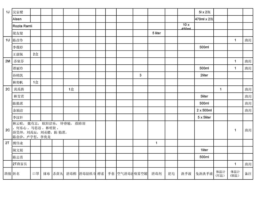 感恩家协成员到校为校园喷雾消毒,爱心妈妈到校为班上桌椅消毒。感恩各商家、社会人士、学生家长及监护人在新冠肺炎非常时期赞助以下防范新冠肺炎用品,您的雪 中送炭,解决了本校的燃眉之急,特此表谢。赞助人如下: