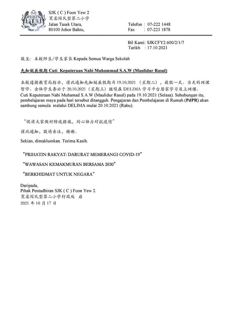 本校遵循教育局指示,谨此通知先知诞辰假期为 19.10.2021 (星期二),放假一天。当天的网课暂停。全体学生务必于20.10.2021(星期三)继续在DELIMA学习平台居家学习及上网课。