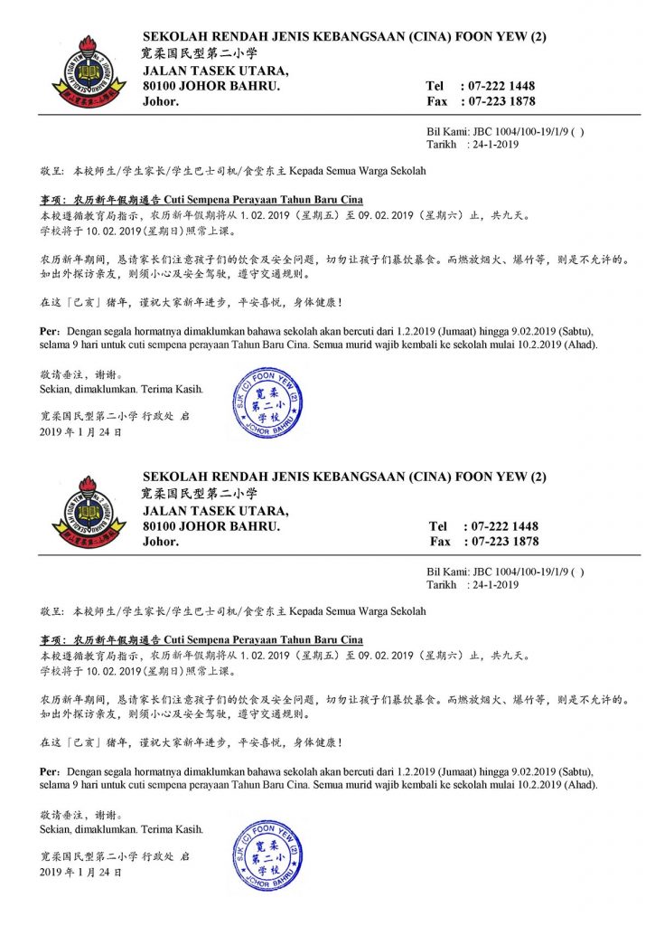 Per:Dengan segala hormatnya dimaklumkan bahawa sekolah akan bercuti dari 1.2.2019 (Jumaat) hingga 9.02.2019 (Sabtu), selama 9 hari untuk cuti sempena perayaan Tahun Baru Cina. Semua murid wajib kembali ke sekolah mulai 10.2.2019 (Ahad).