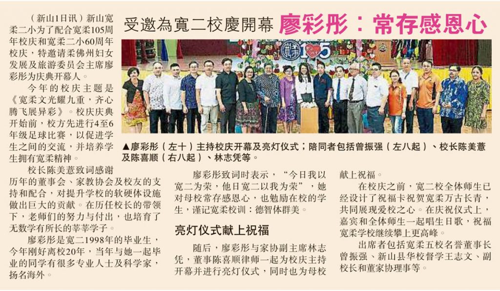 受邀为宽二校庆开幕-廖彩彤:常存感恩心