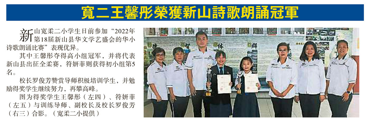 宽二王馨彤荣获新山诗歌朗诵冠军
