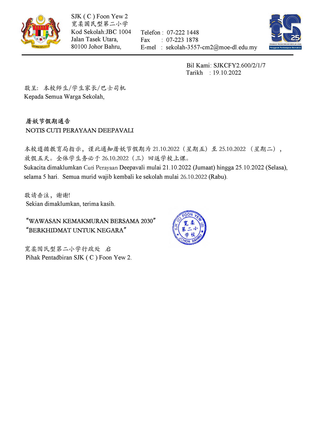 本校遵循教育局指示,谨此通知屠妖节假期为21.10.2022(星期五)至25.10.2022 (星期二),放假五天。全体学生务必于26.10.2022(三)回返学校上课。