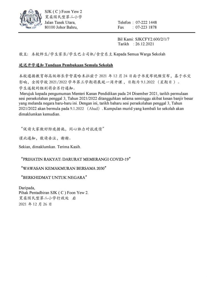 本校遵循教育部高级部长拿督莫哈末拉兹于2021年12月24日面子书发布视频宣布,基于水灾影响,全国学校2021/2022学年第三学期将展延一周开课 ,日期为9.1.2022 (星期日 )。 学生返校的组别将会另行通知。