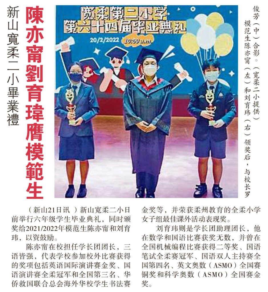 新山宽柔二小毕业礼-陈亦甯刘育玮膺模范生