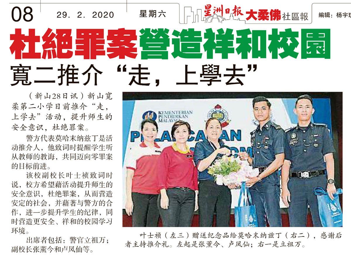 新闻 校内活动 活动 通告与新闻 杜绝罪案营造祥和校园-宽二推介“走,上学去” February 29, 2020February 29, 2020 AdminTeam 1426 Views 星洲日报剪报