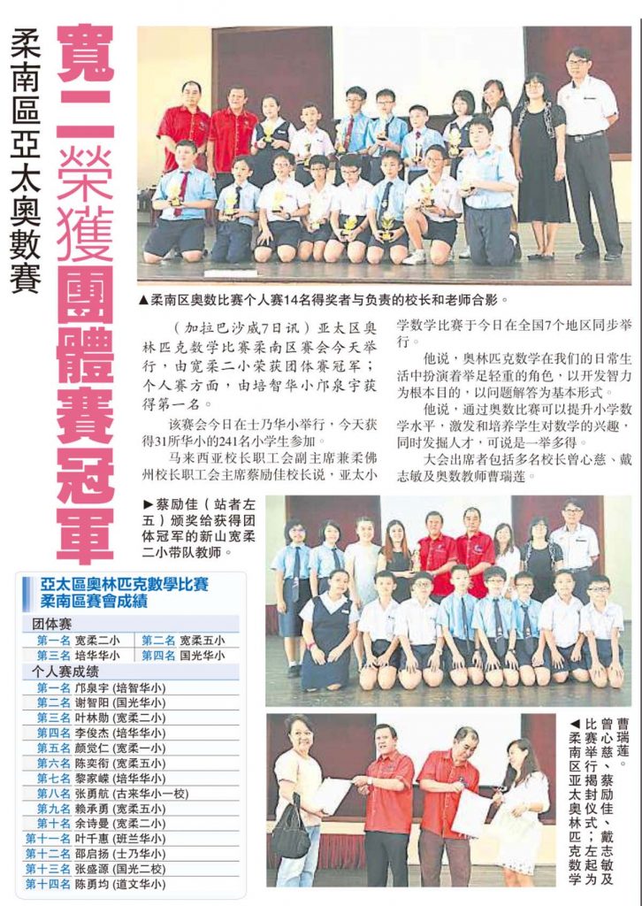 柔南区亚太奥数赛-宽二荣获团体赛冠军