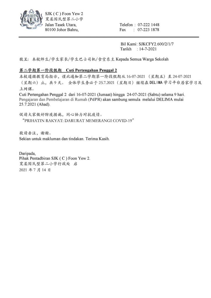 本校遵循教育局指示,谨此通知第二学期第一阶段假期从 16-07-2021 (星期五)至24-07-2021(星期六)止,共9天。全体学生务必于25.7.2021(星期日)继续在DELIMA学习平台居家学习及上网课。