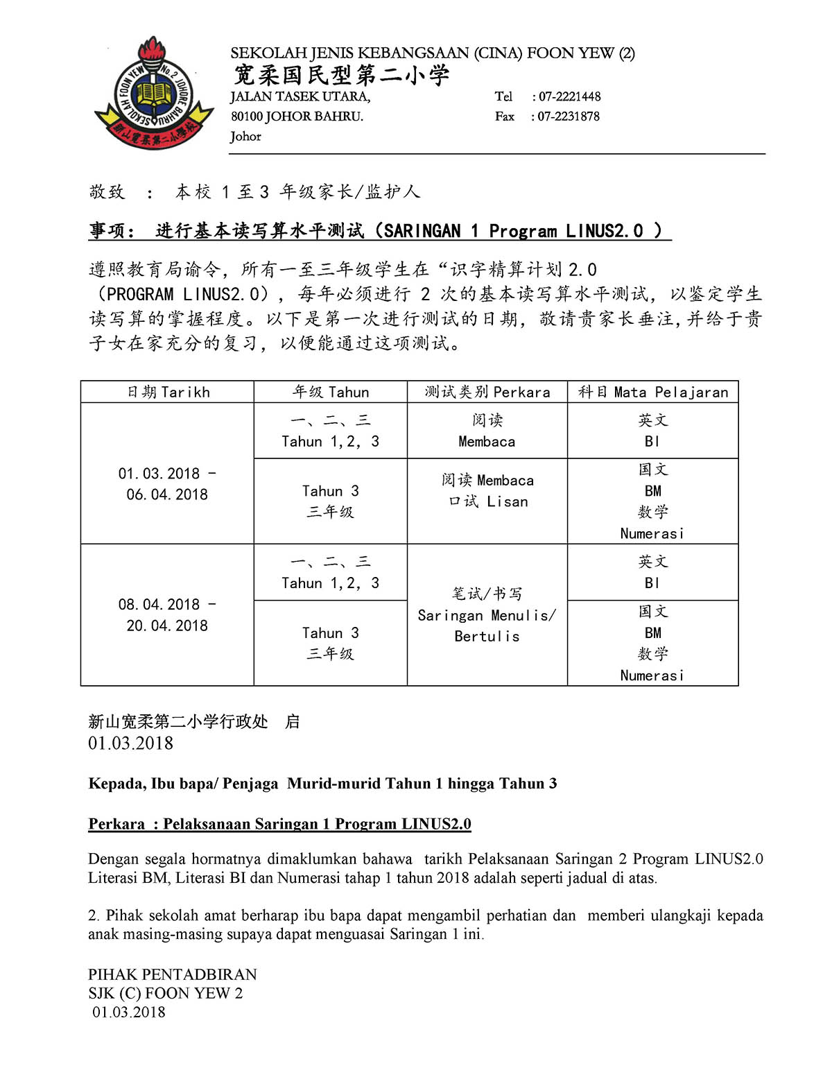 遵照教育局谕令,所有一至三年级学生在“识字精算计划2.0(PROGRAM LINUS2.0), 每年必须进行2次的基本读写算水平测试,以鉴定学生读写算的掌握程度。以下是第一次进行测试的日期,敬请贵家长垂注,并给于贵子女在家充分的复习,以便能通过这项测试。