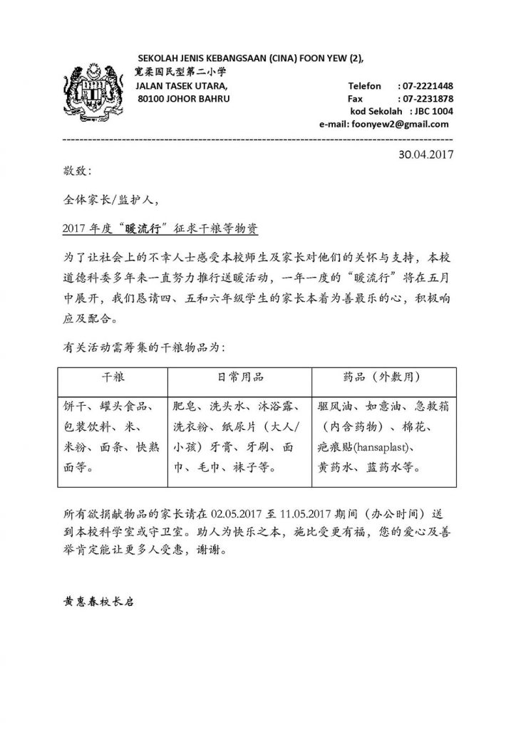 所有欲捐献物品的家长请在 02.05.2017 至11.05.2017期间(办公时间)送到本校科学室或守卫室。