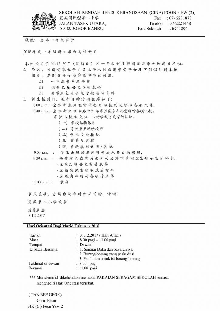 本校经定于31.12.2017(星期日)为一年级新生报到日及举办迎新日活动。