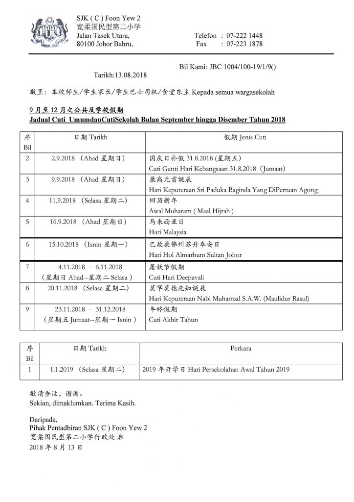 Jadual Cuti UmumdanCutiSekolah Bulan September hingga Disember Tahun 2018