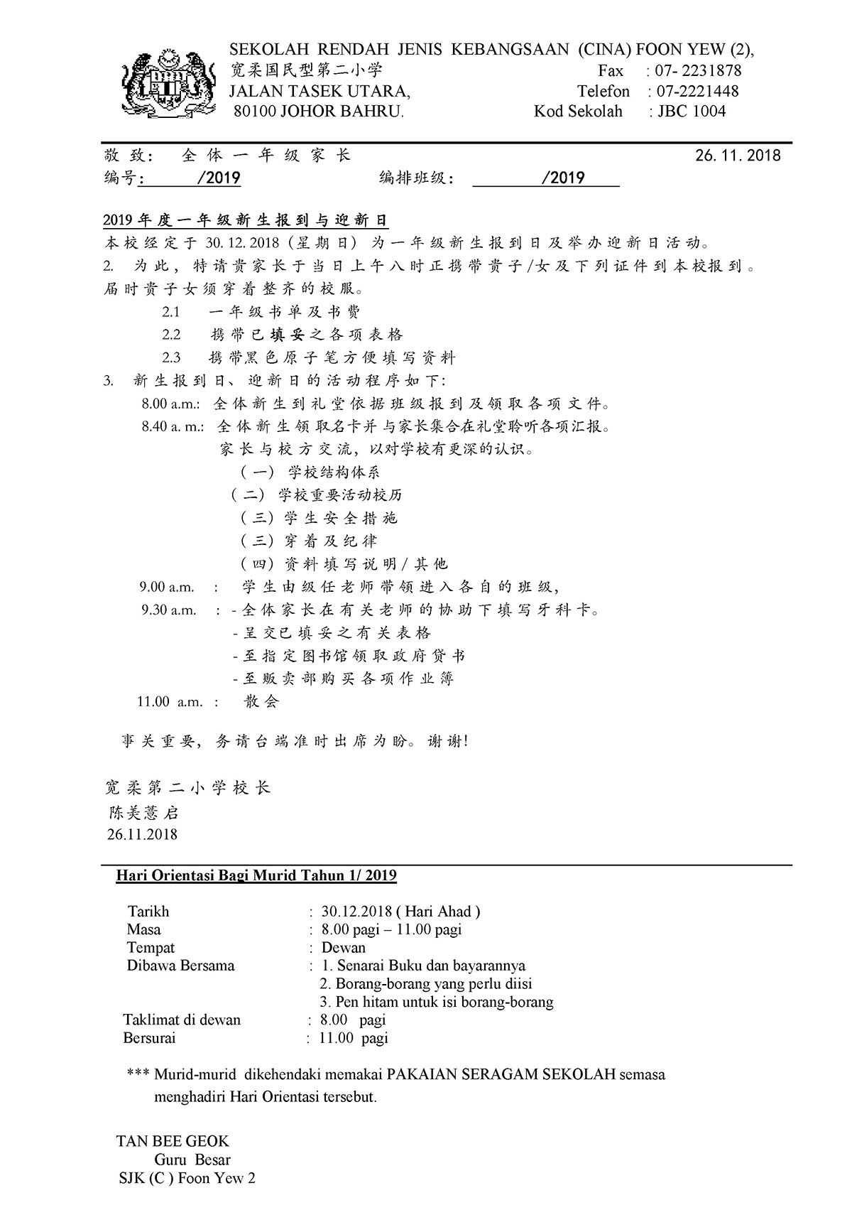 本校经定于30.12.2018(星期日)为一年级新生报到日及举办迎新日活动。