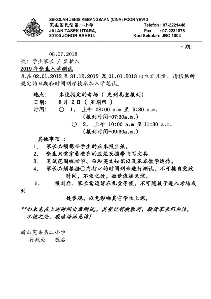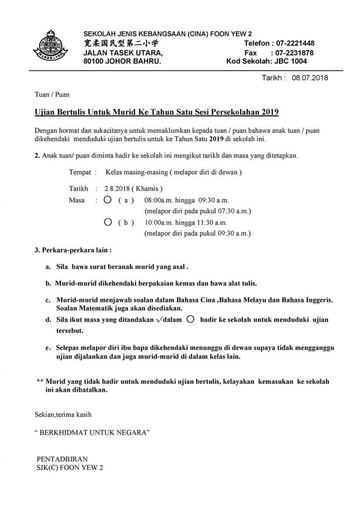 Dengan hormat dan sukacitanya untuk memaklumkan kepada tuan/puan bahawa anak tuan/puan dikehendaki menduduki ujian bertulis untuk ke Tahun Satu 2019 di sekolah ini.
