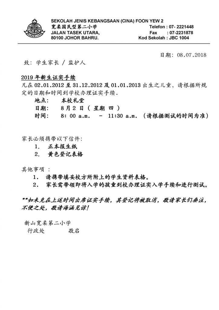 **如未克在上述时间出席证实手续,其登记将被取消,敬请家长们垂注,不便之处,敬请海涵见谅!