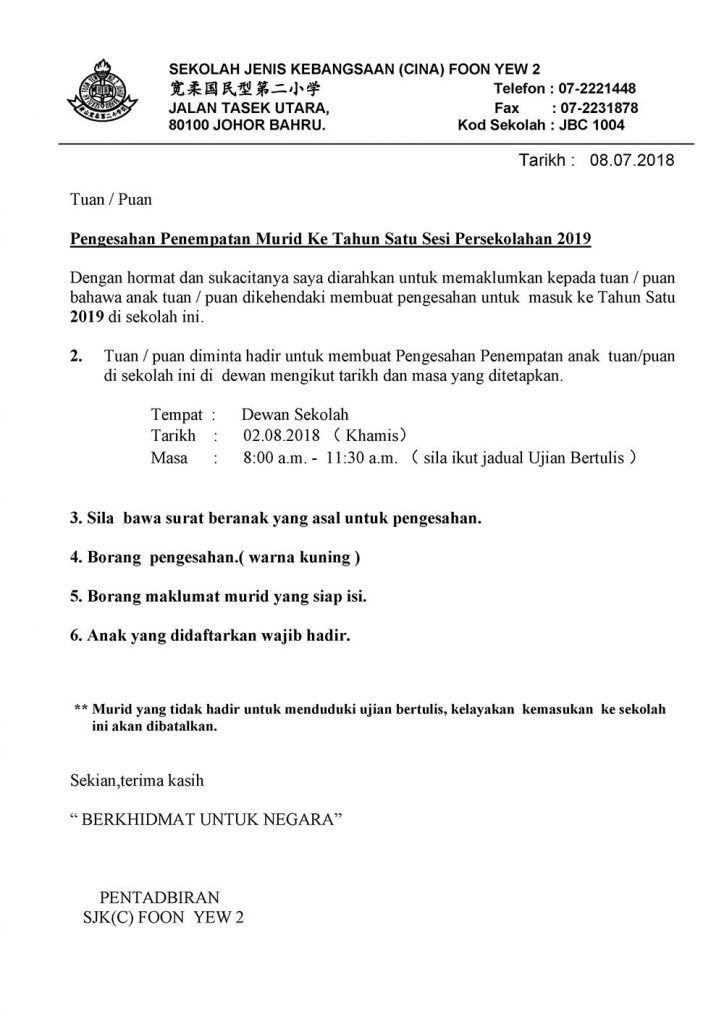 Dengan hormat dan sukacitanya saya diarahkan untuk memaklumkan kepada tuan/puan bahawa anak tuan/puan dikehendaki membuat pengesahan untuk masuk ke Tahun Satu 2019 di sekolah ini.