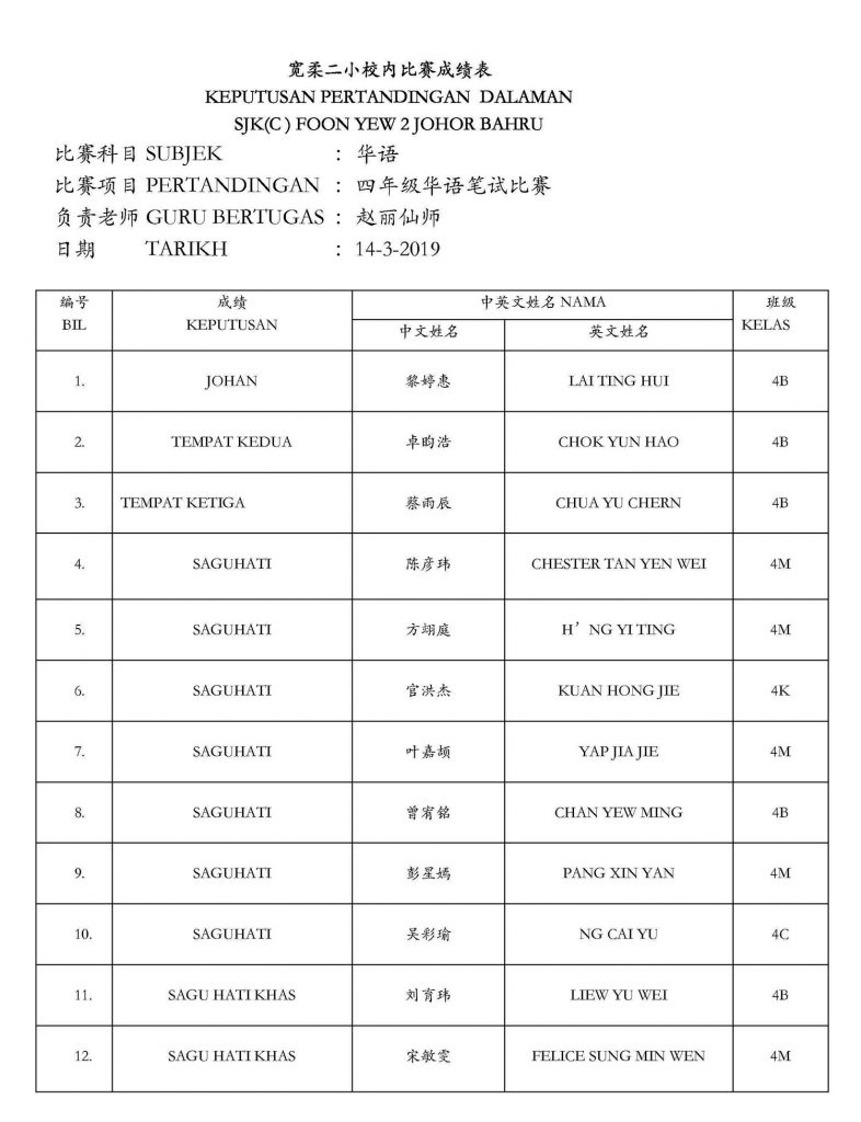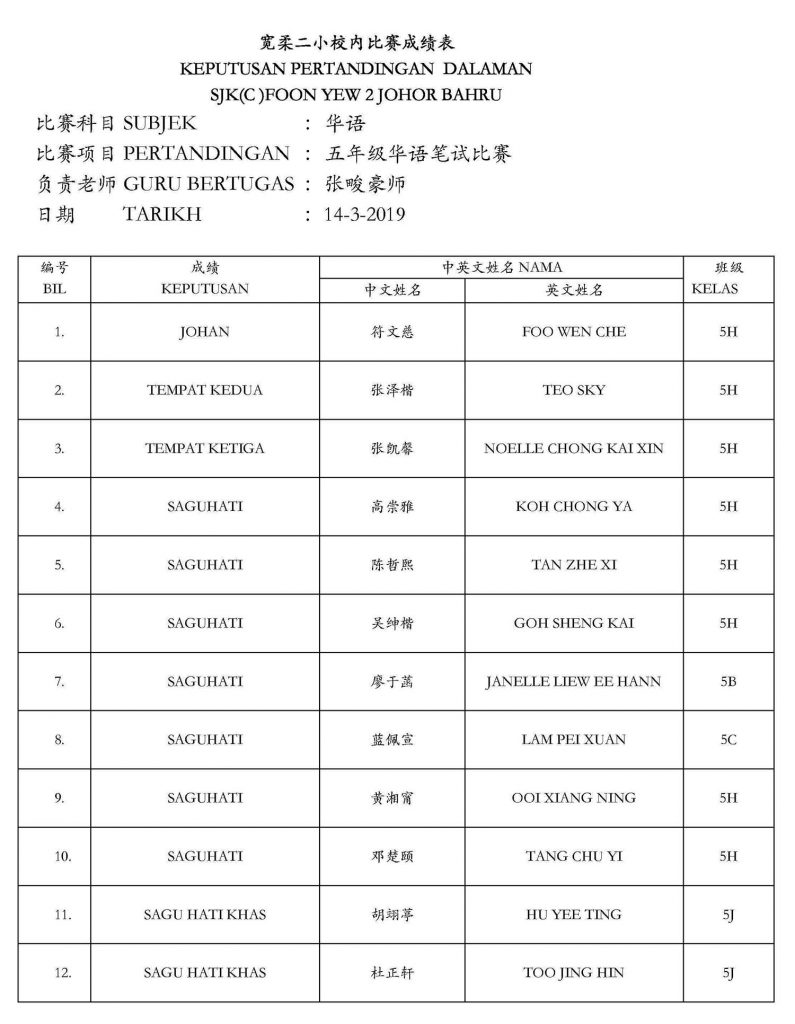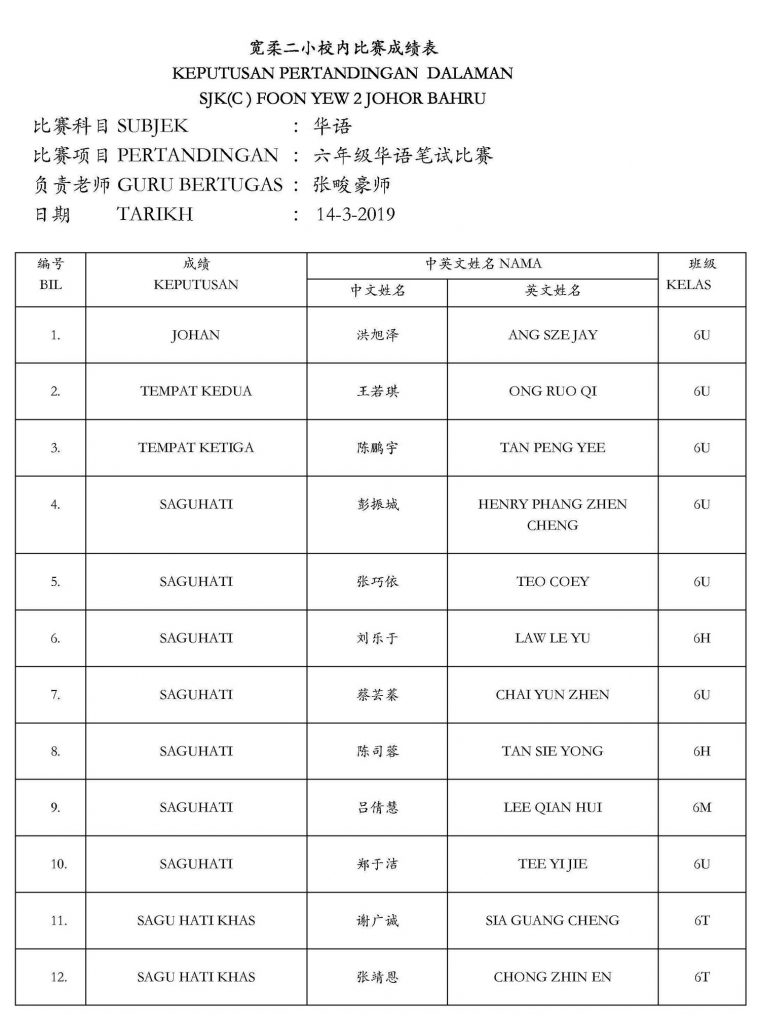 2019年校内华文笔试比赛