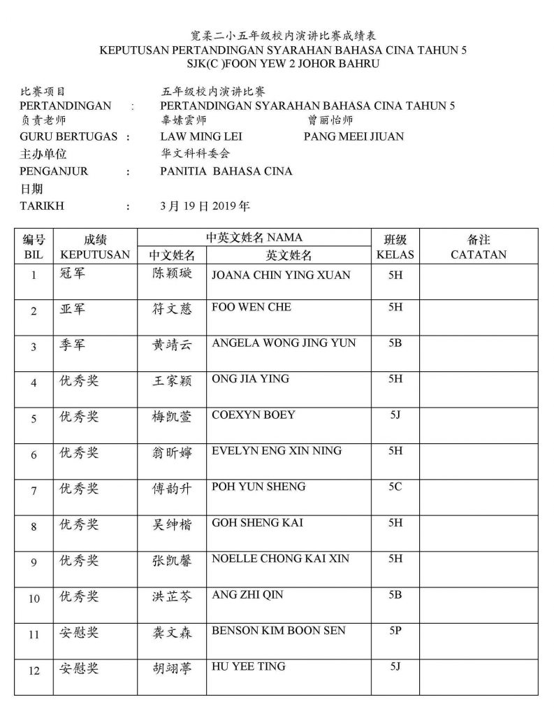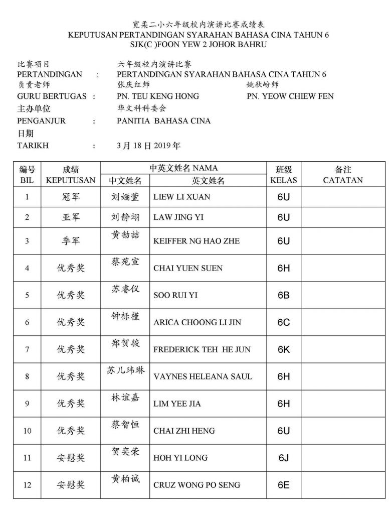 2019年校内华文笔试比赛