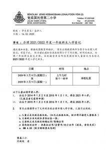 谨此通知台鉴,根据我国教育部指示, 家长必须提前两年为贵子女办理入学登记。有鉴于此,校方谨此通知台端本校将订于下列日期、时间及地点,办理一年级新生登记手续。本校接受来自邻近花园区的儿童登记为本校之2021/2022年度入学之新生。