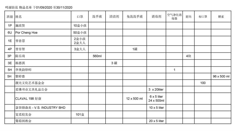 详情 >>鸣谢防范物品名单(01-09-2020~30-11-2020)。